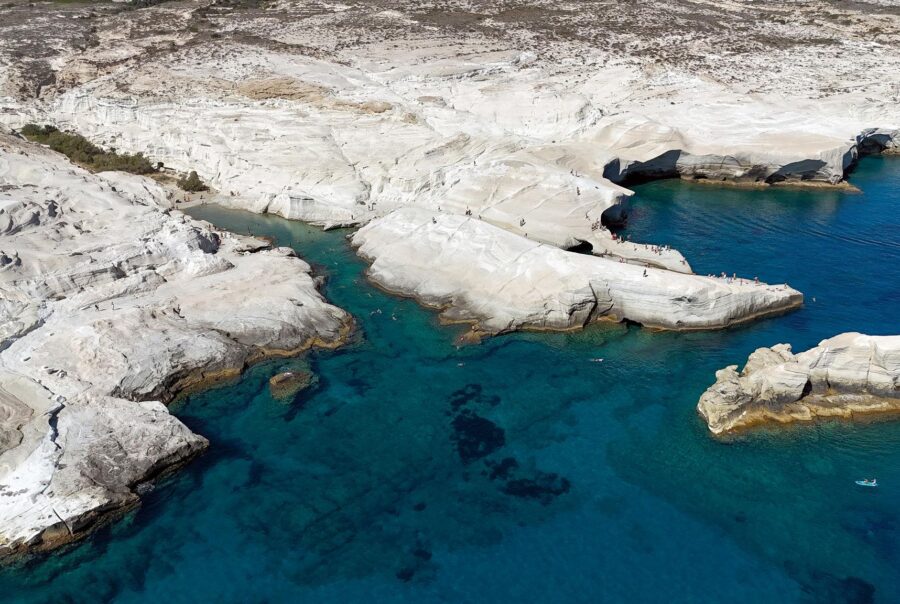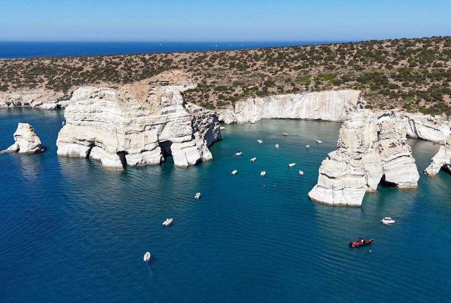 Kleftiko is one of Milos’ most breathtaking coastal locations, famous for its towering white cliffs, hidden caves, and vivid turquoise waters. Because it is mainly accessible by boat, the journey itself becomes part of the adventure. Once there, visitors can swim through caves, snorkel in exceptionally clear water, and admire the dramatic rock arches sculpted by the sea. It is widely considered a highlight of any trip to the island.