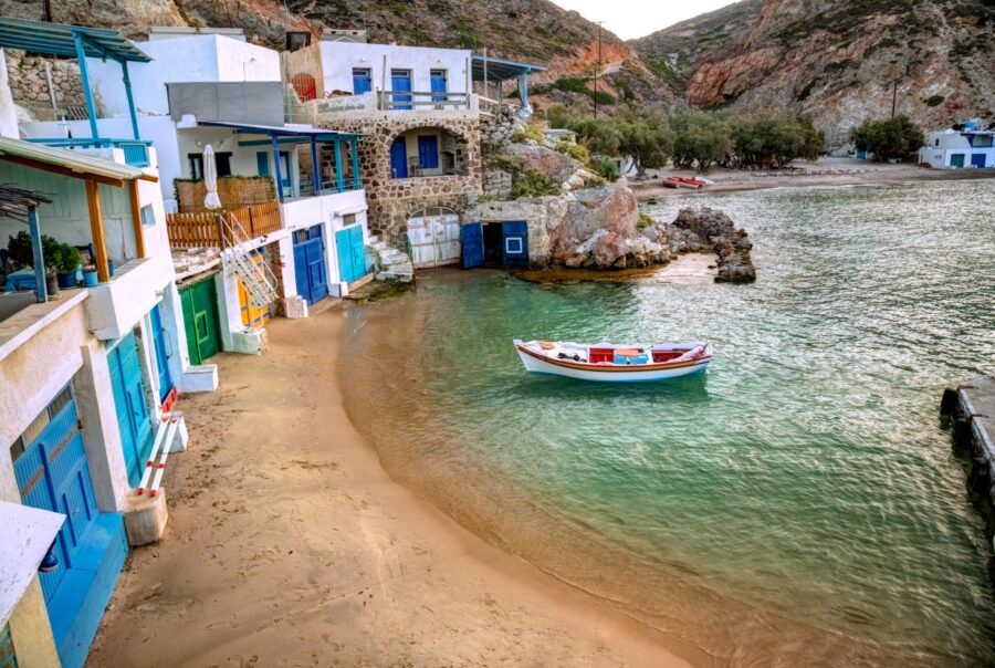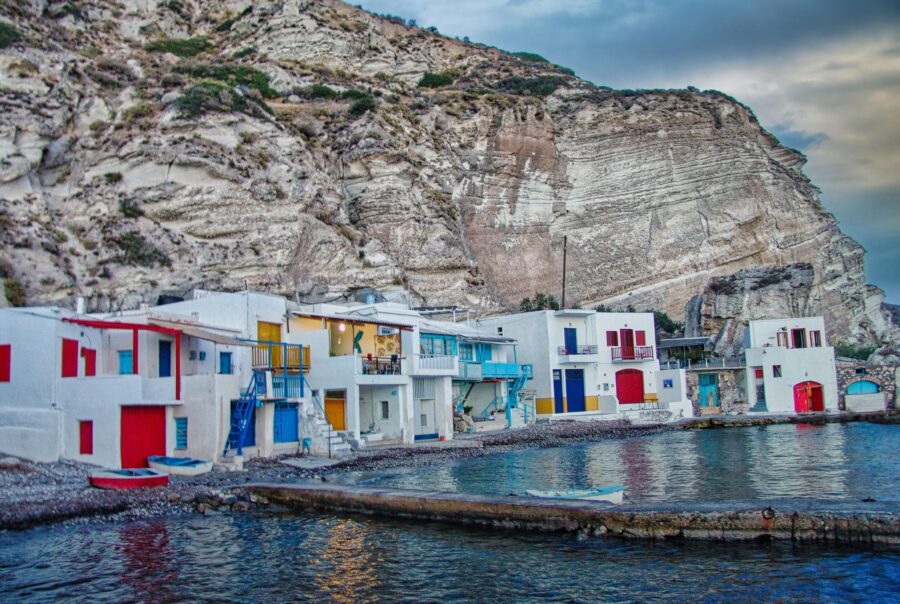Klima is a traditional fishing village renowned for its two-story houses with vividly colored doors and balconies. Originally built to shelter fishing boats, these homes now form one of the most picturesque scenes in Milos. The village is especially magical at sunset, when warm light reflects off the water and illuminates the colorful facades, making it a favorite spot for photographers and romantics alike.